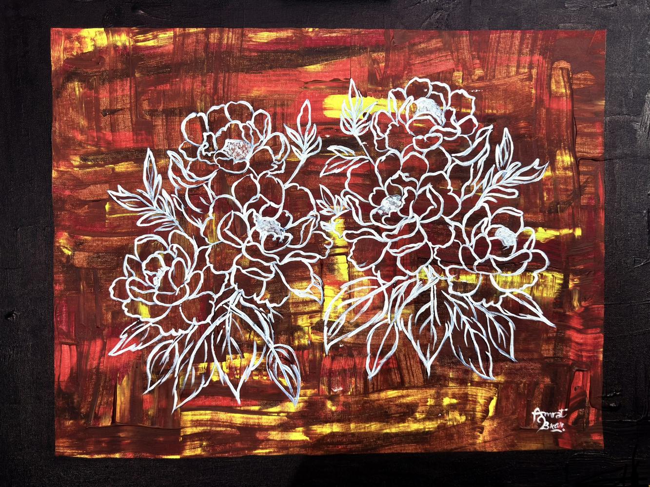 Amid this explosive canvas of fiery red-orange and molten yellow, white-outlined flowers burst forth with fierce elegance, their bold silhouettes channeling raw rage into radiant creation. Like embers forged into blossoms, they symbolize the alchemy of anger-turning inner turmoil into something fiercely beautiful, a testament to the power of transmutation.